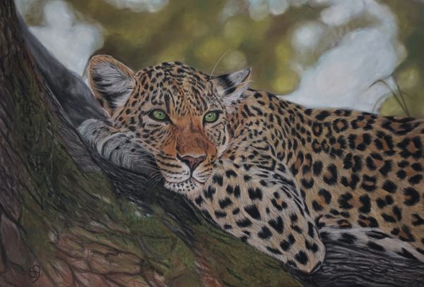 SOLD "The Lazy Leopard" Pan Pastels and pastel pencils on Pastelmat paper. 16 x 22 framed. Prints available on my etsy and zazzle shops.